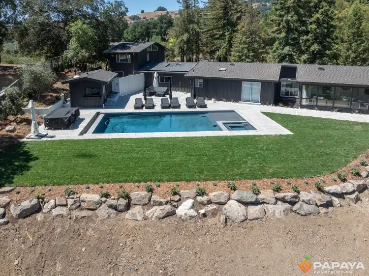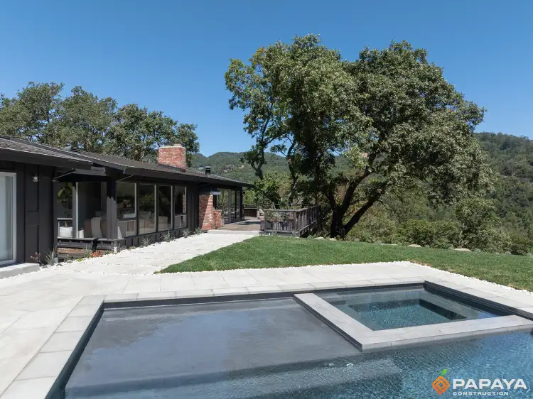 - Custom pool construction with integrated spa, designed and built from the ground up