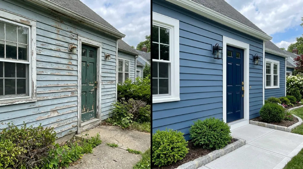 Before and after exterior house painting showing a worn home transformed with fresh blue siding, white trim, and improved curb appeal