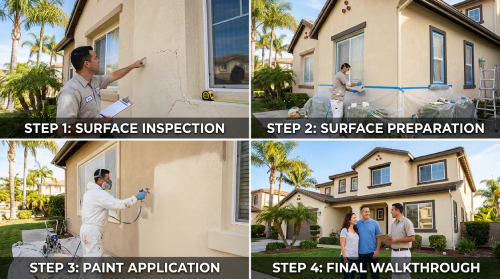 Step-by-step exterior painting process showing surface inspection, preparation, paint application, and final walkthrough on an Orange County home