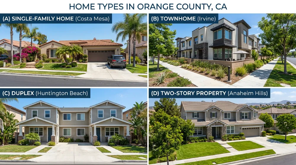Collage of Orange County home types including a single-family home, townhome, duplex, and two-story property for exterior painting services
