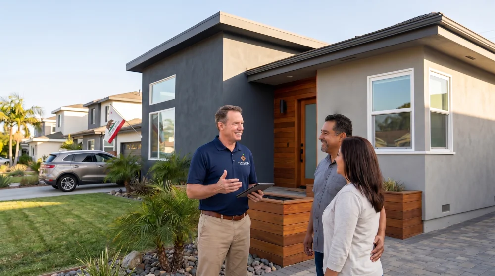 Papaya Construction Group estimator meeting homeowners outside a freshly painted Orange County home for a free exterior house painting estimate