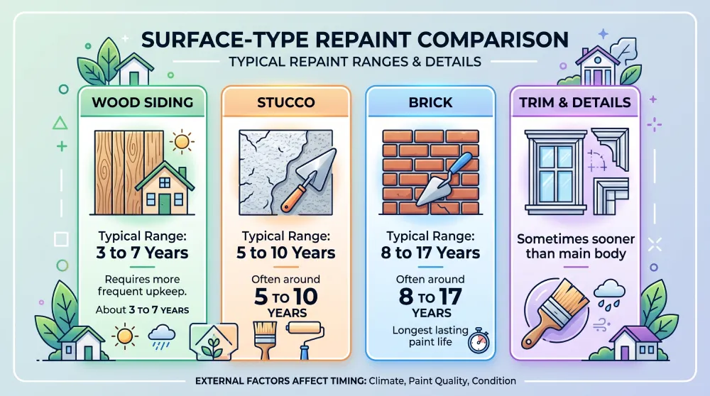 Surface-type repaint comparison graphic showing typical repaint ranges for wood siding, stucco, brick, and trim details